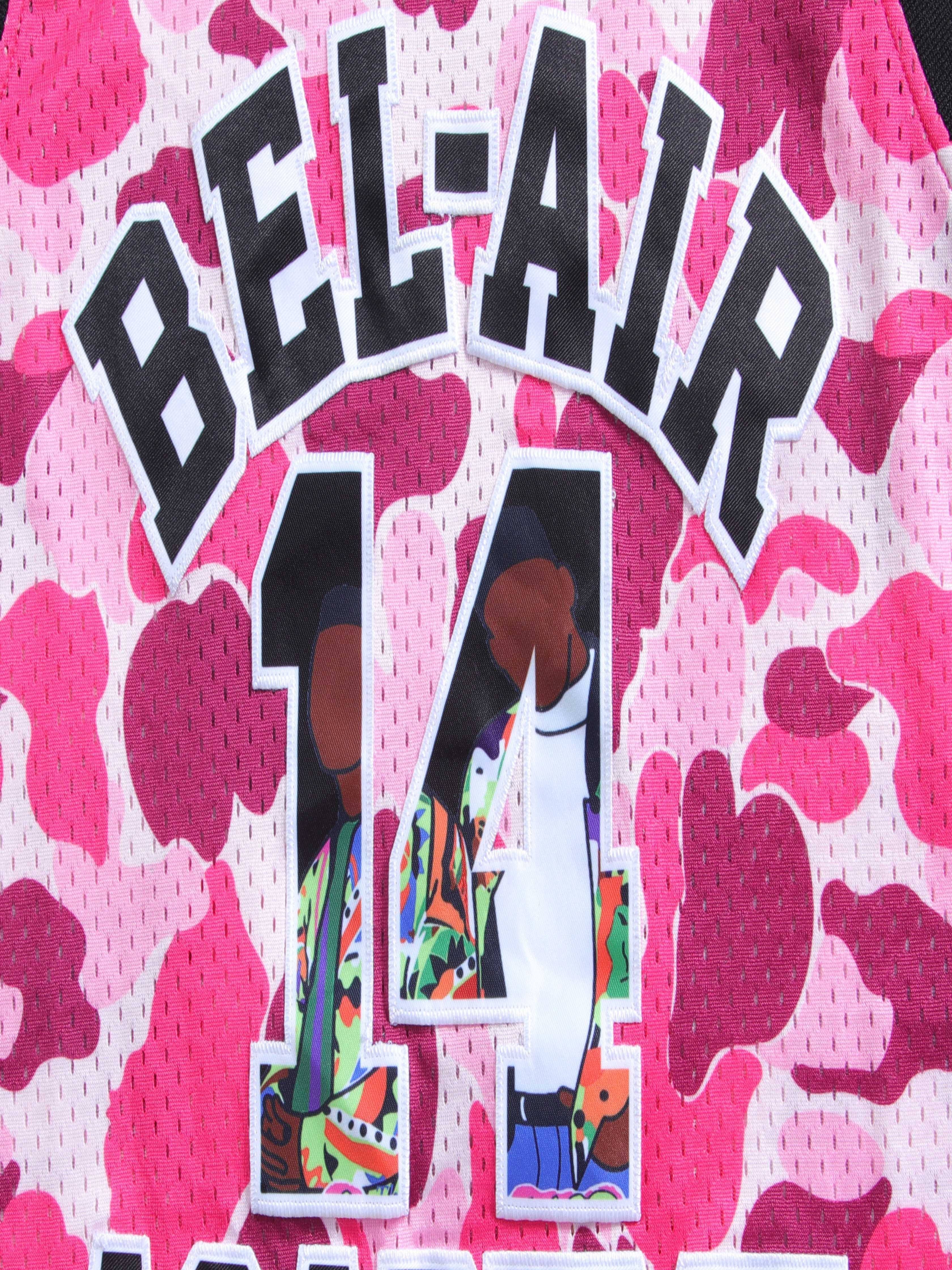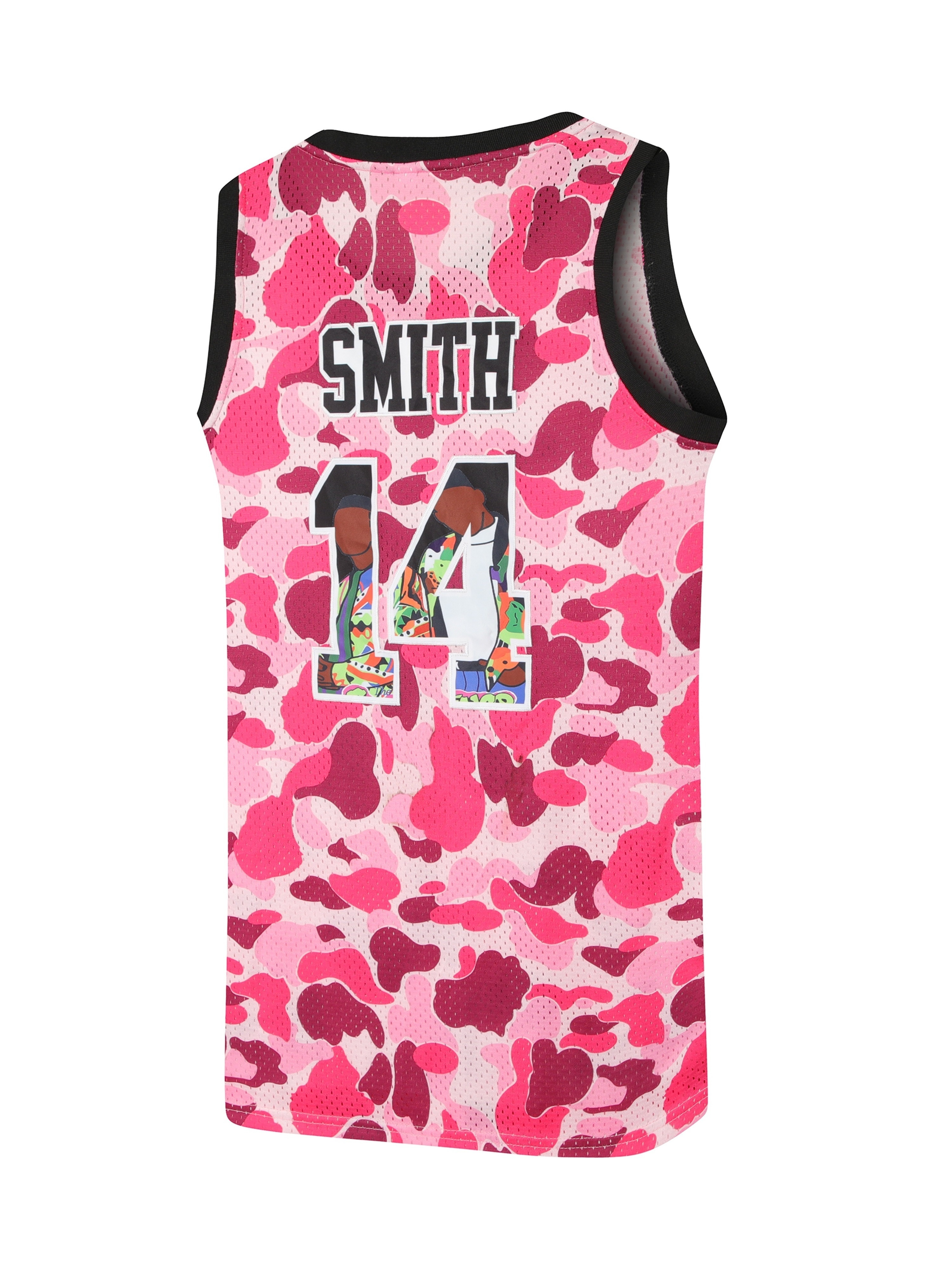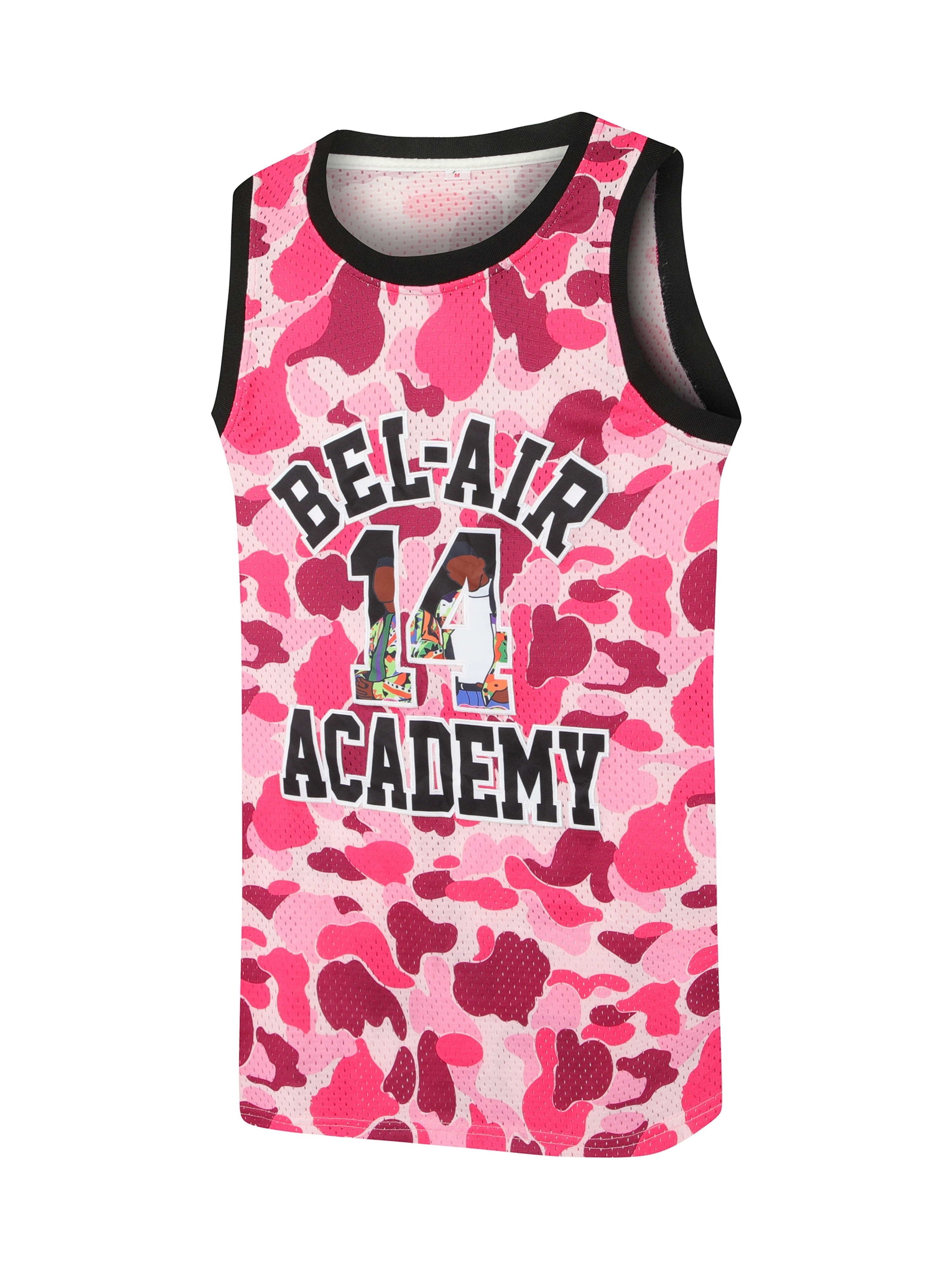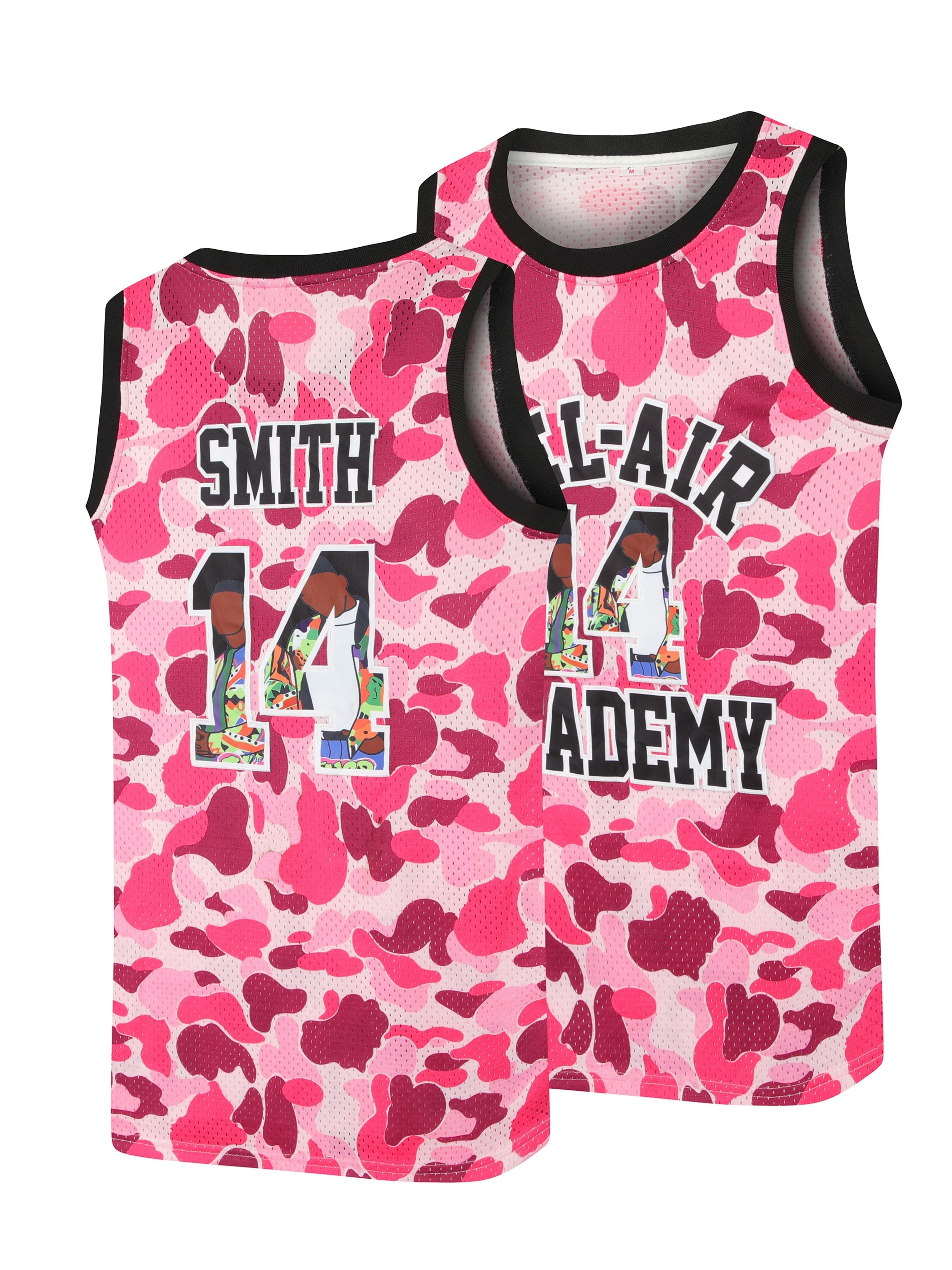 Men's #14 Retro 90s Hip-Hop Basketball Jersey - Pink & White Camo Design, "Smith Academy" & Cartoon Player, Moisture-Wicking, Breathable Mesh Lining, Sleeveless Sports Vest for Parties, Fan Gifts & All Seasons