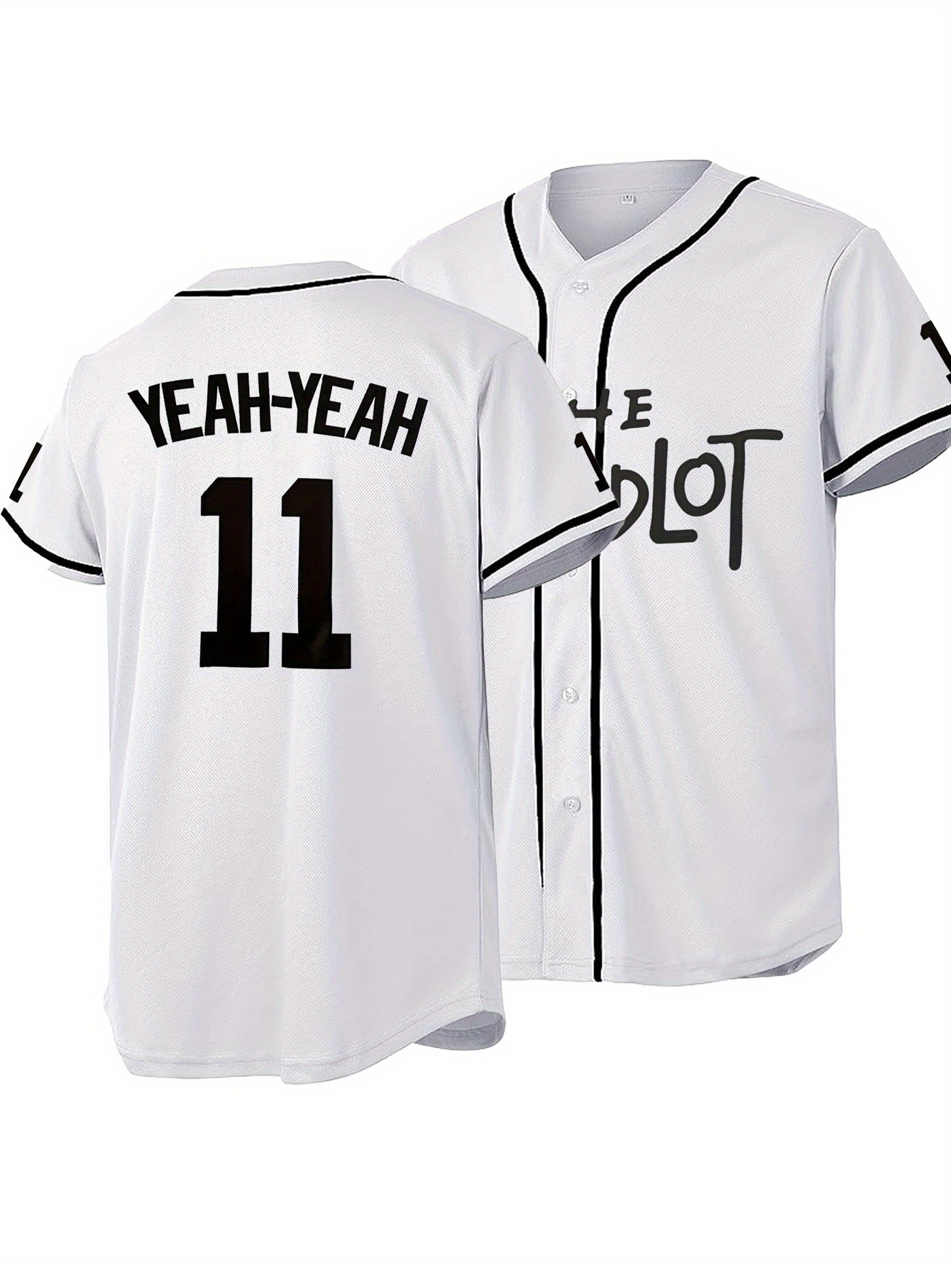 Men's White #11 Baseball Shirt - Loose Fit V-Neck Embroidered "YEAH-YEAH" & LOT Graphic, Breathable Button-Up Sportswear for Streetwear, Outdoor & Casual Wear, All-Season Comfort, Baseball Jersey, Sports Comfort Wear, Durable Sportswear