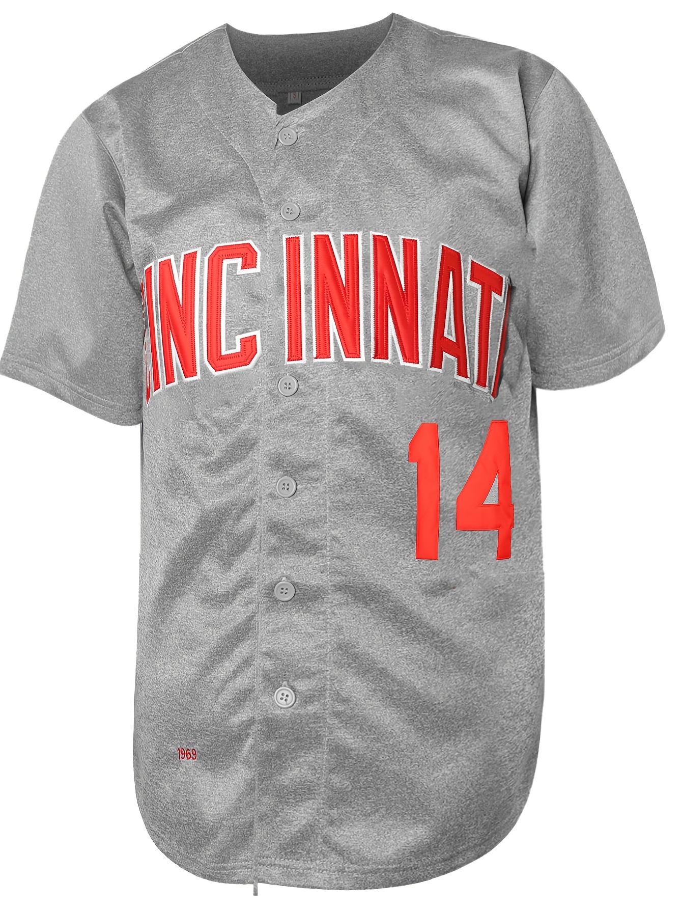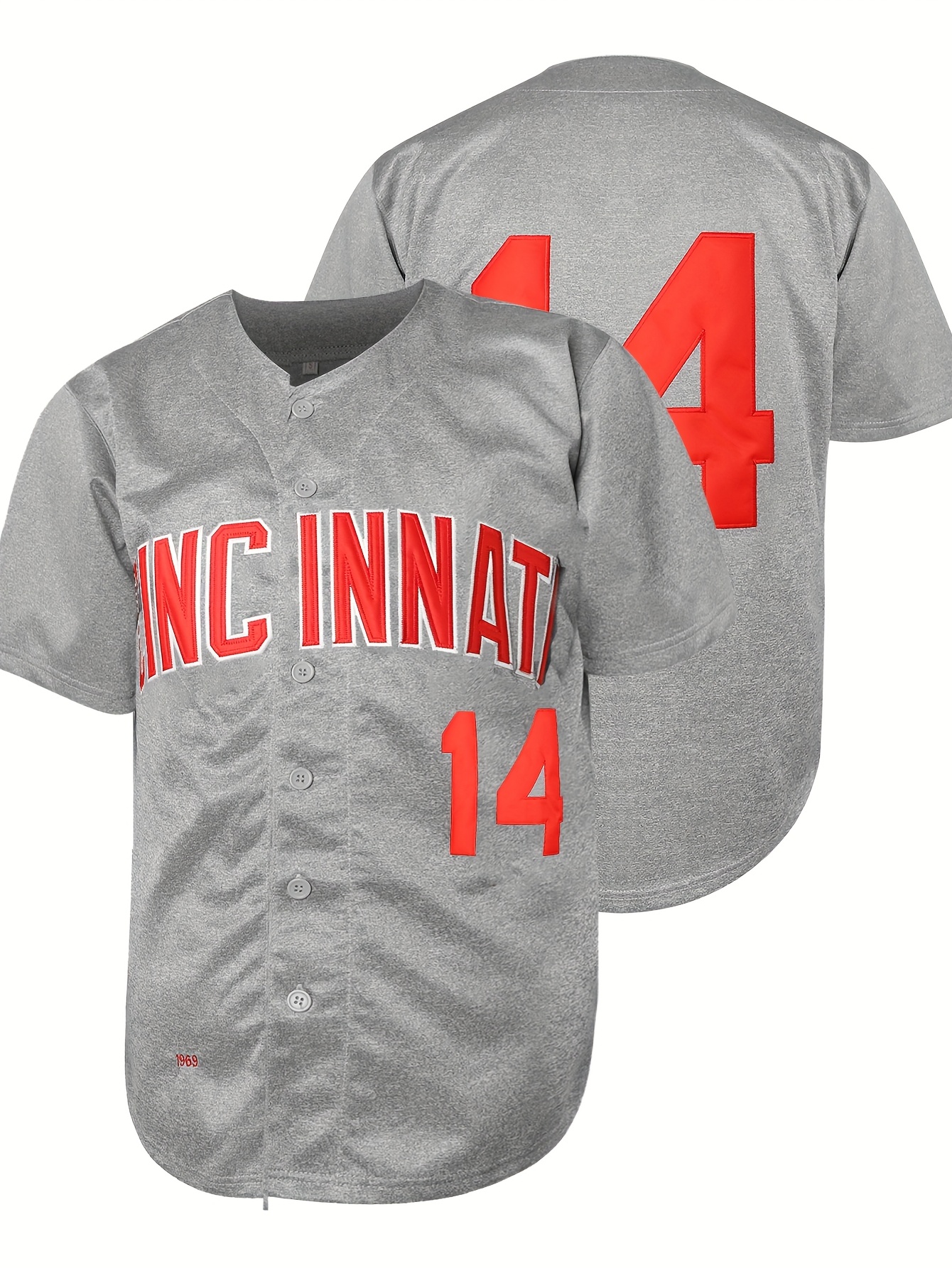 Stitched #14 Grey Baseball Jersey Red Letter Embroidery V Neck Short Sleeve Baseball Shirt, Breathable Button-Up Sports Uniform For Training Competition Party