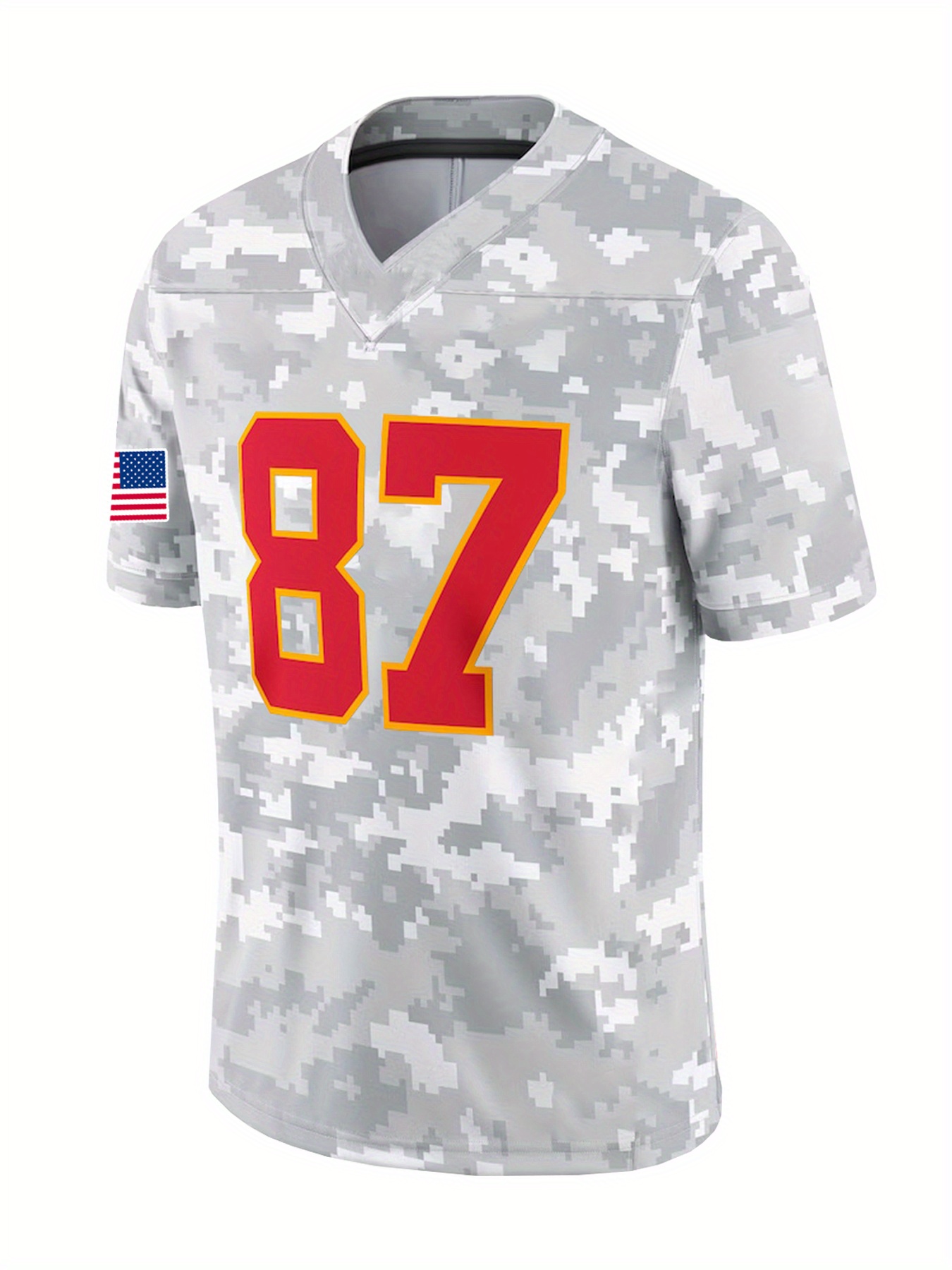 Men's #87 Retro Grey Sports Jersey - Breathable Polyester V-Neck Loose Fit T-Shirt with Camouflage Pattern All-Season Top for Football,, Parties, Streetwear | Machine Washable, Unisex Design for Men & Couples, Sports T Shirt, Party Attire, Detailing