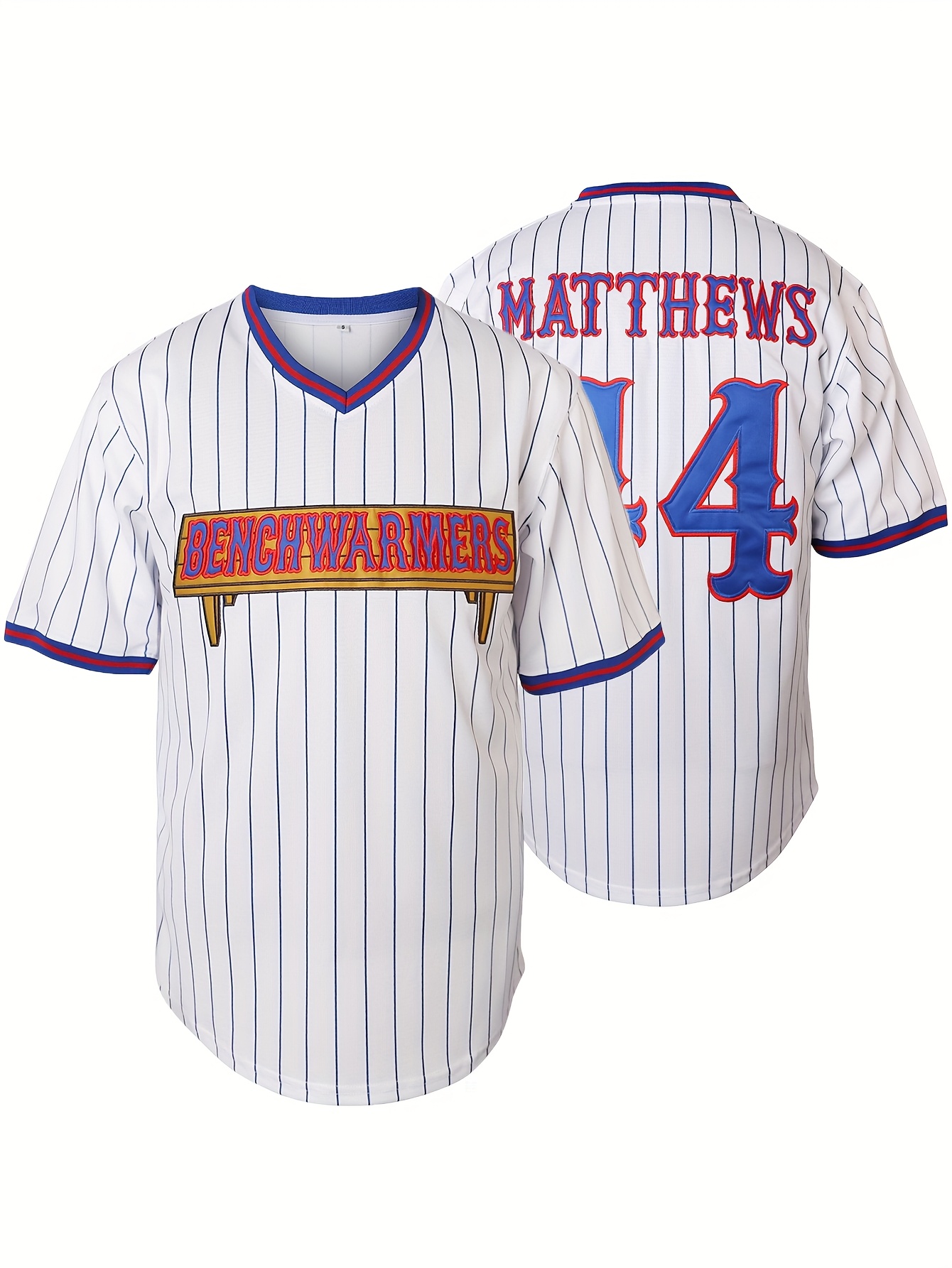 Men's White Polyester Baseball Jersey | V-Neck with Red & Blue Stripes | Embroidered #44 and BENGHAMMERS Design | Breathable, Machine Washable | Ideal for Training, Casual & Party Wear | Suitable for Spring to Autumn